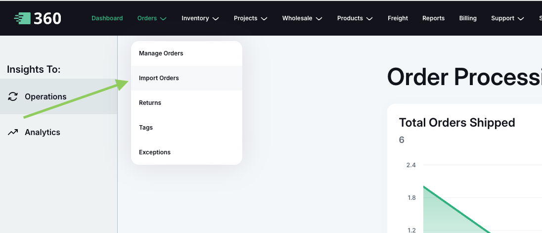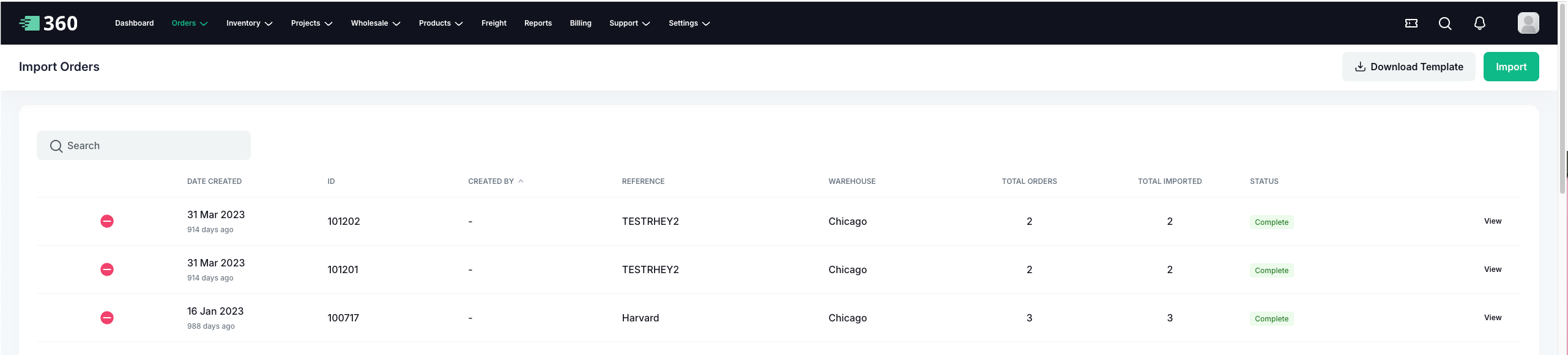 From the menu bar, select Orders > Import Orders. From this page, you can see any previously imported orders and search them from the search bar on the left. On the right, you can select the Import button to start the import process: