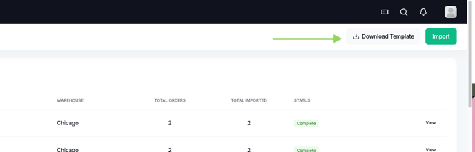 Once you have downloaded the template and formatted your information, you can re-upload the file under the Import Orders button. If you have multiple warehouse locations assigned to your account, make sure to select the correct warehouse you want your orders to be imported to: