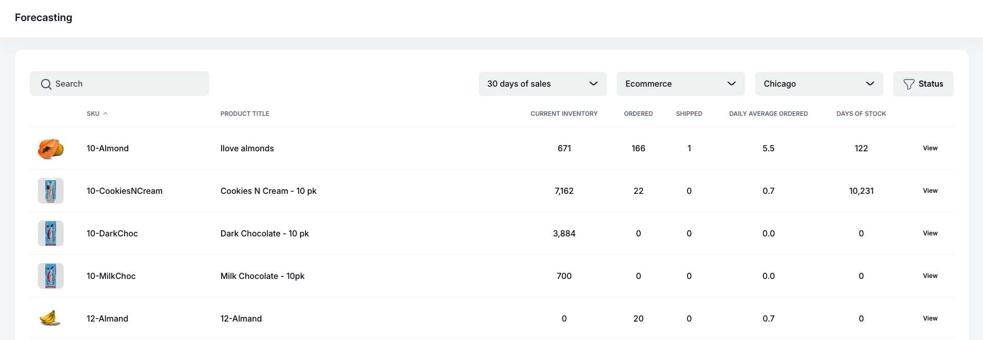 If you want to see some more data on your inventory, you can see data for total number of the SKU ordered, daily average, and days of stock under Forecasting.
