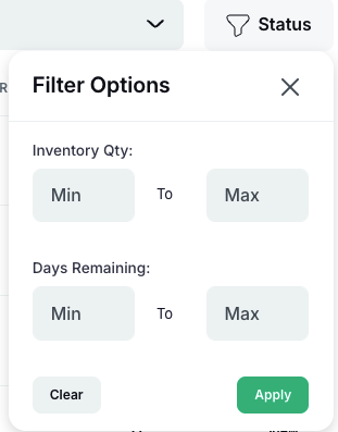 You can change the warehouse location and number of days for the data from the right hand side, as well as the filter options: