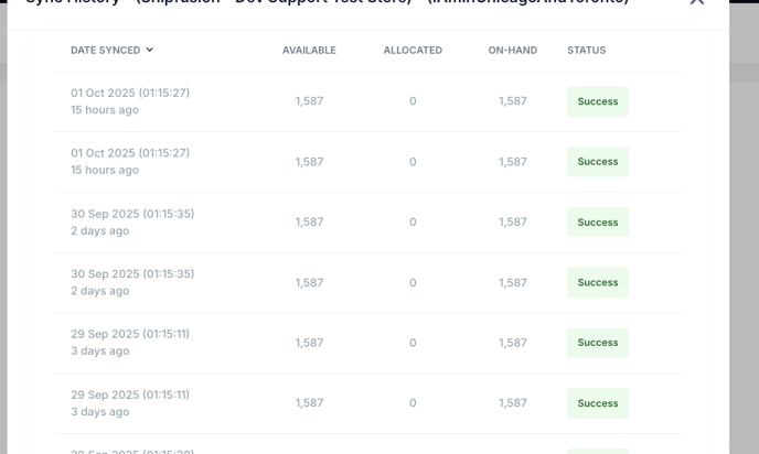 In the corresponding popup, you will see the history of syncs for the selected SKU: