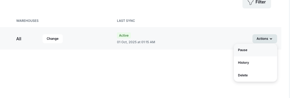 If you wish to Pause or Resume a sync, you can do this under the same Actions button and select either Pause or Resume. The system will give you a confirmation in the top right if either action has been done successfully.