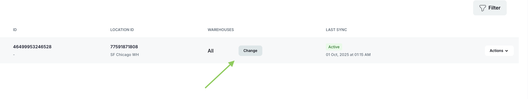 To ‘edit’ or change a warehouse, navigate to the SKU in question and select the change button under warehouses: