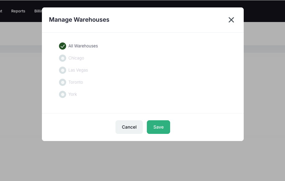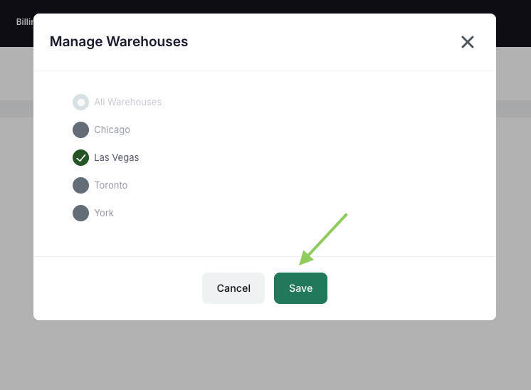 Select the specific, correct warehouse’s checkbox, and then select the Save button:
