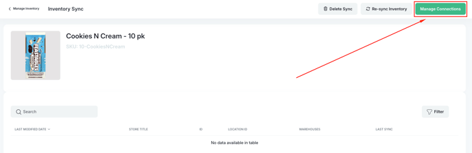 You can connect or re-connect your SKUs through the Manage Connections button. This will look at your active sales channels and check for any inventory connections that can be established: